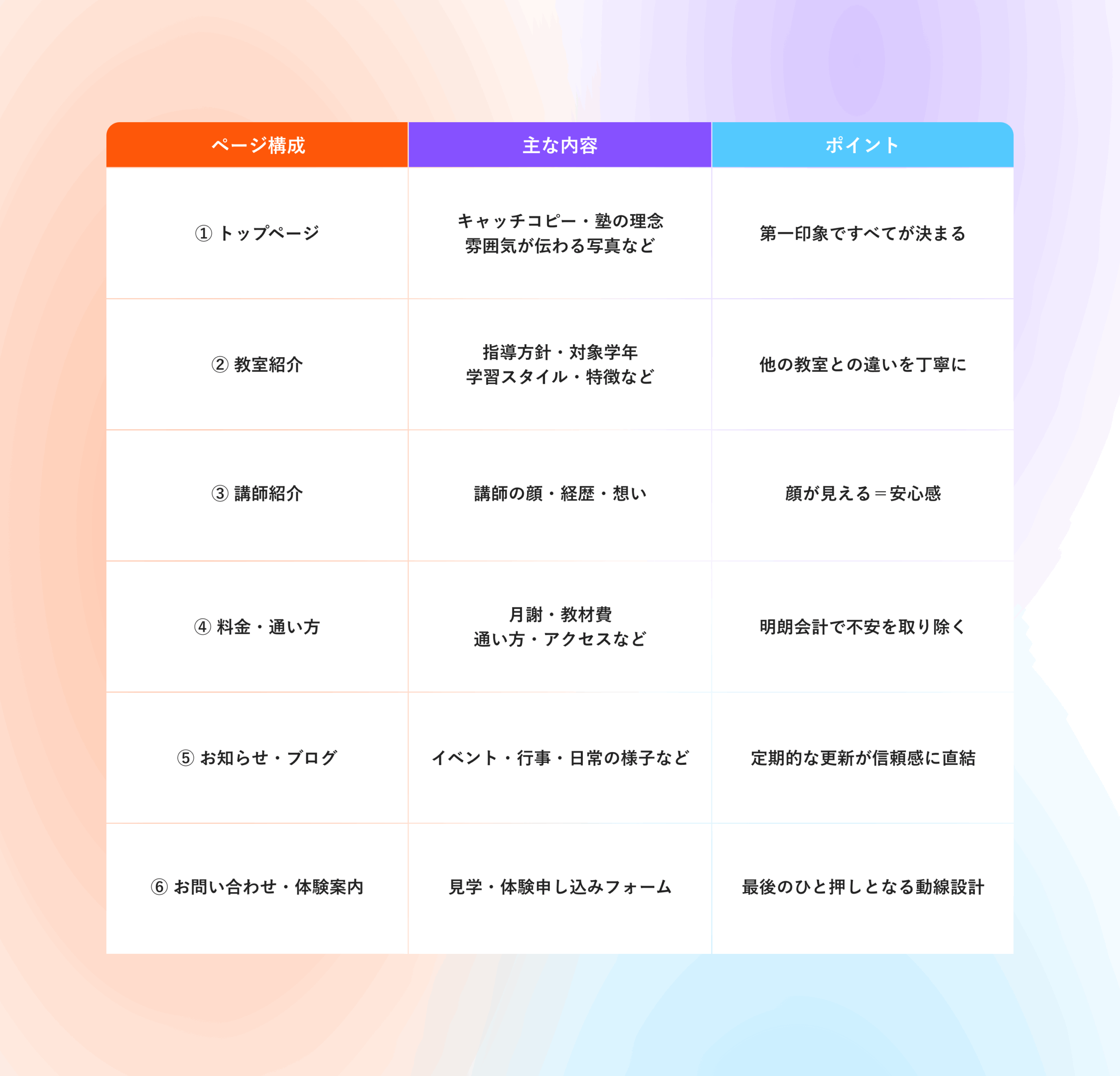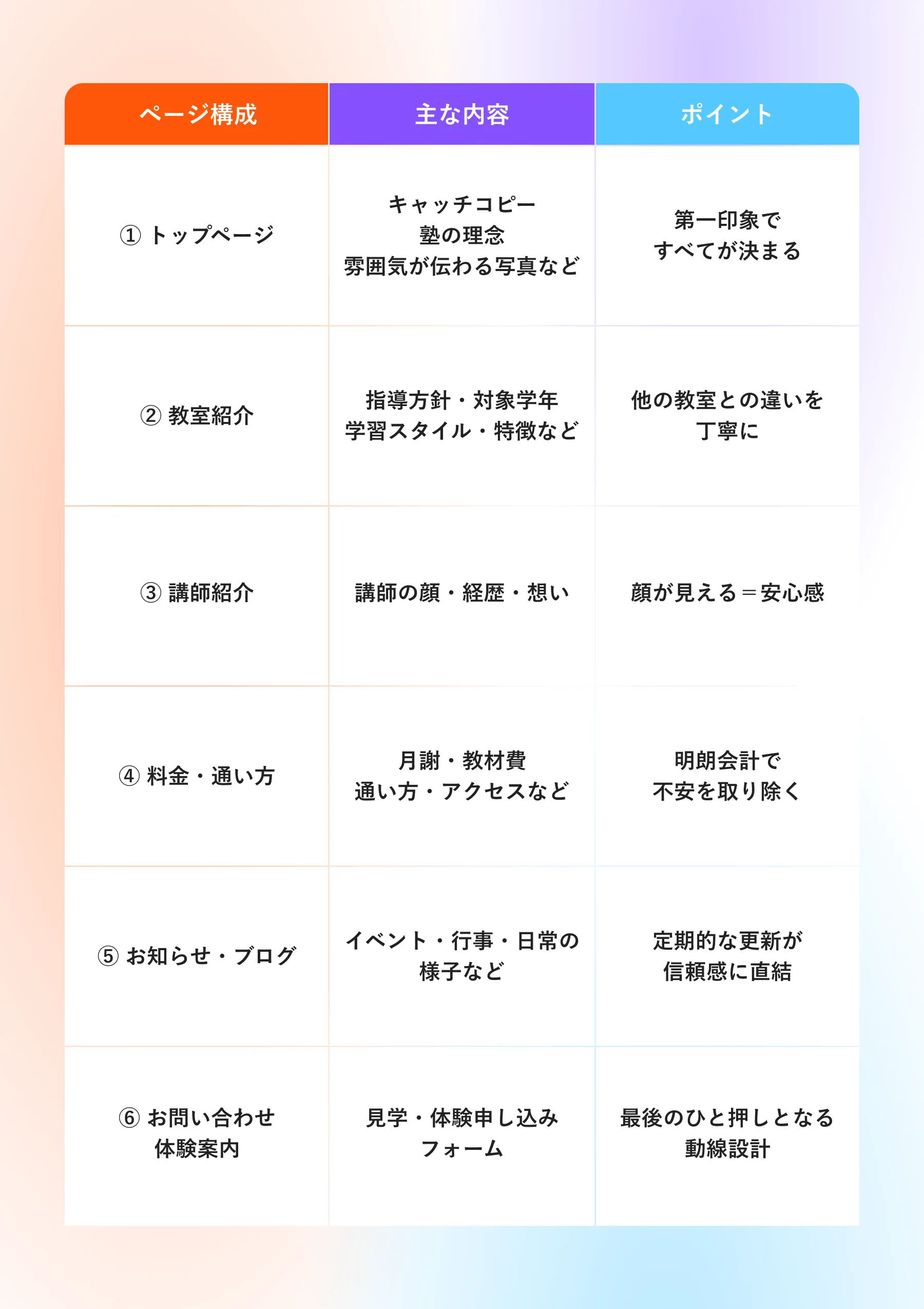 塾のホームページは、難しいコンテンツや派手なデザインよりも、「どんな場所で・誰が教えていて・ どう通えるのか」この3つのポイントを抑えることが重要です。まずは「どこに」「何を」載せるべきかを整理し、あなたの想いが伝わる構成を考えてみてください。