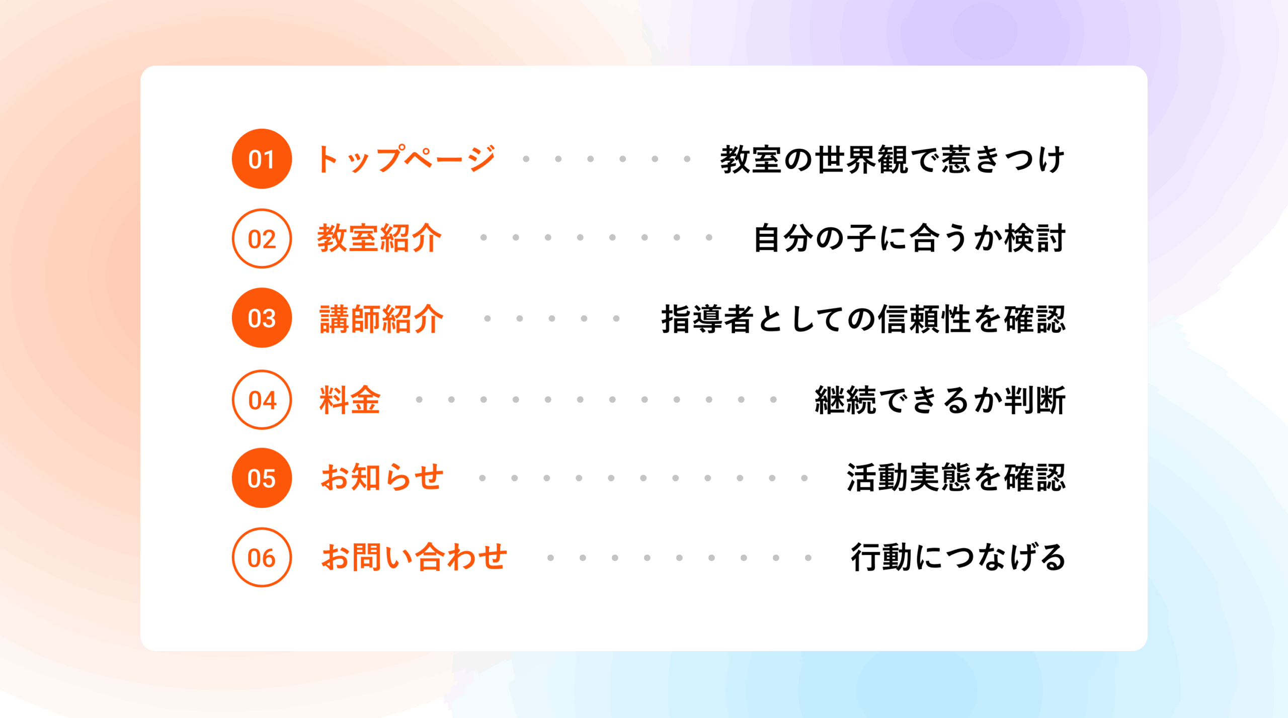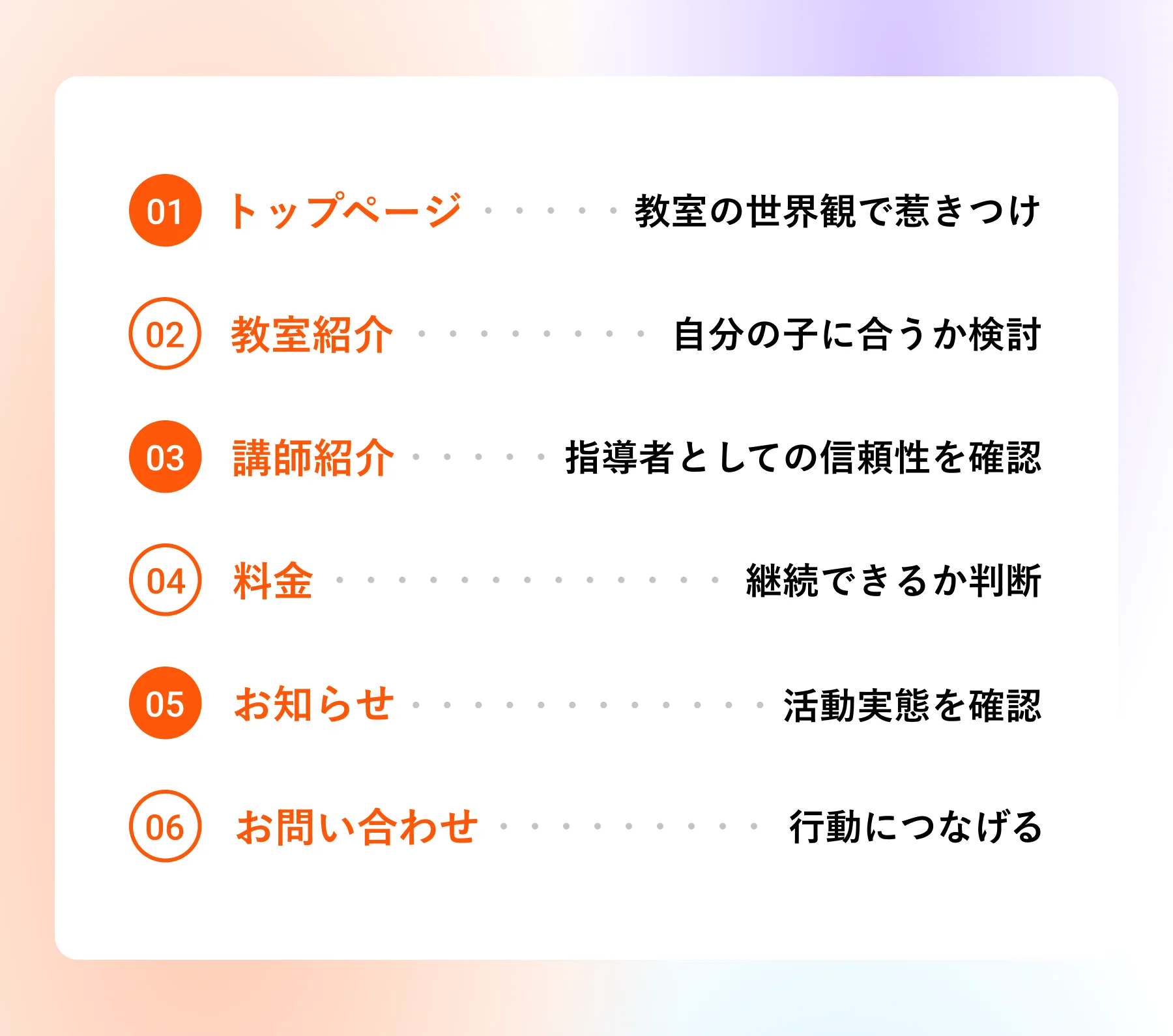 情報の“内容”と同じくらい大切なのが、「順番」と「流れ」です。閲覧者が安心して次のページに進みたくなる流れを意識しましょう。